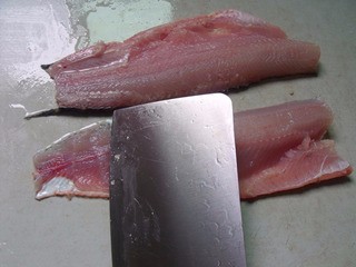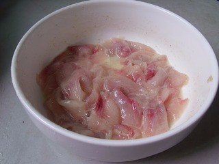 3、魚肉塊洗干凈血污,下面放一塊廚房巾,刀斜40度,從尾部開(kāi)始片魚,方向是刀刃朝向尾部。片成魚片!片好的魚片,用一湯匙鹽搓洗一遍后沖水反復(fù)淘洗成晶瑩透明的魚片。一定要洗成透明的魚片,魚肉比較有口感,而且清爽。魚片用鹽一茶匙 白胡椒一茶匙 蛋清半個(gè) 干淀粉三茶匙腌漬,用手仔細(xì)反復(fù)抓拌均勻。靜置20分鐘!