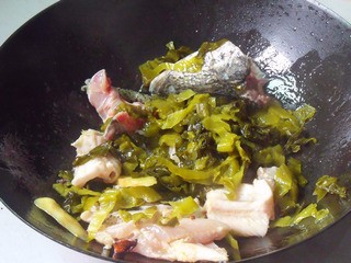 4、酸菜切絲焯水備用。辣椒切圈和花椒一起。魚頭骨魚皮準(zhǔn)備好,姜切片。鍋里放油炒香蔥姜蒜,下入魚頭魚尾魚骨頭魚皮等炒一分鐘。放入酸菜繼續(xù)炒一分鐘。兌足量開(kāi)水。