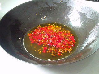 7、鍋里放油,涼油的時(shí)候就放入花椒和辣椒圈,小火燒,注意看辣椒,變得紅中微黃且油亮干酥。注意觀察別熬過(guò)火了。